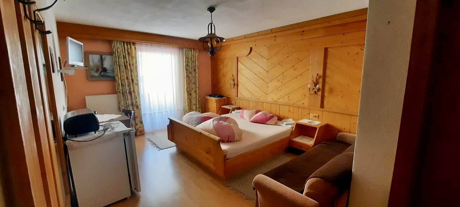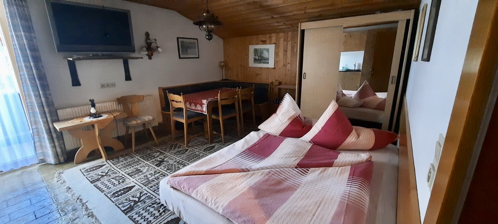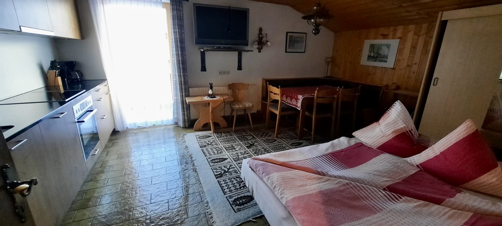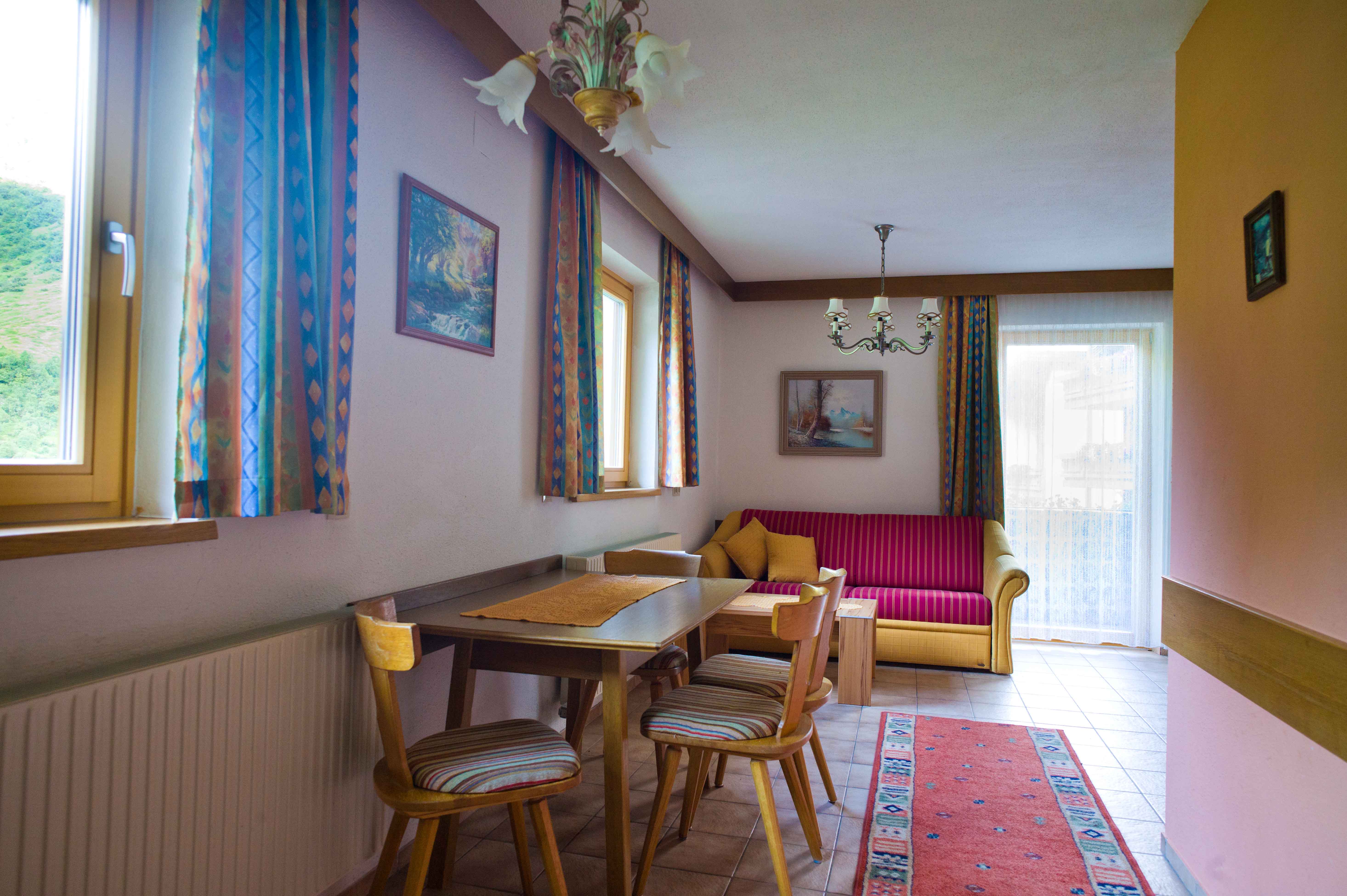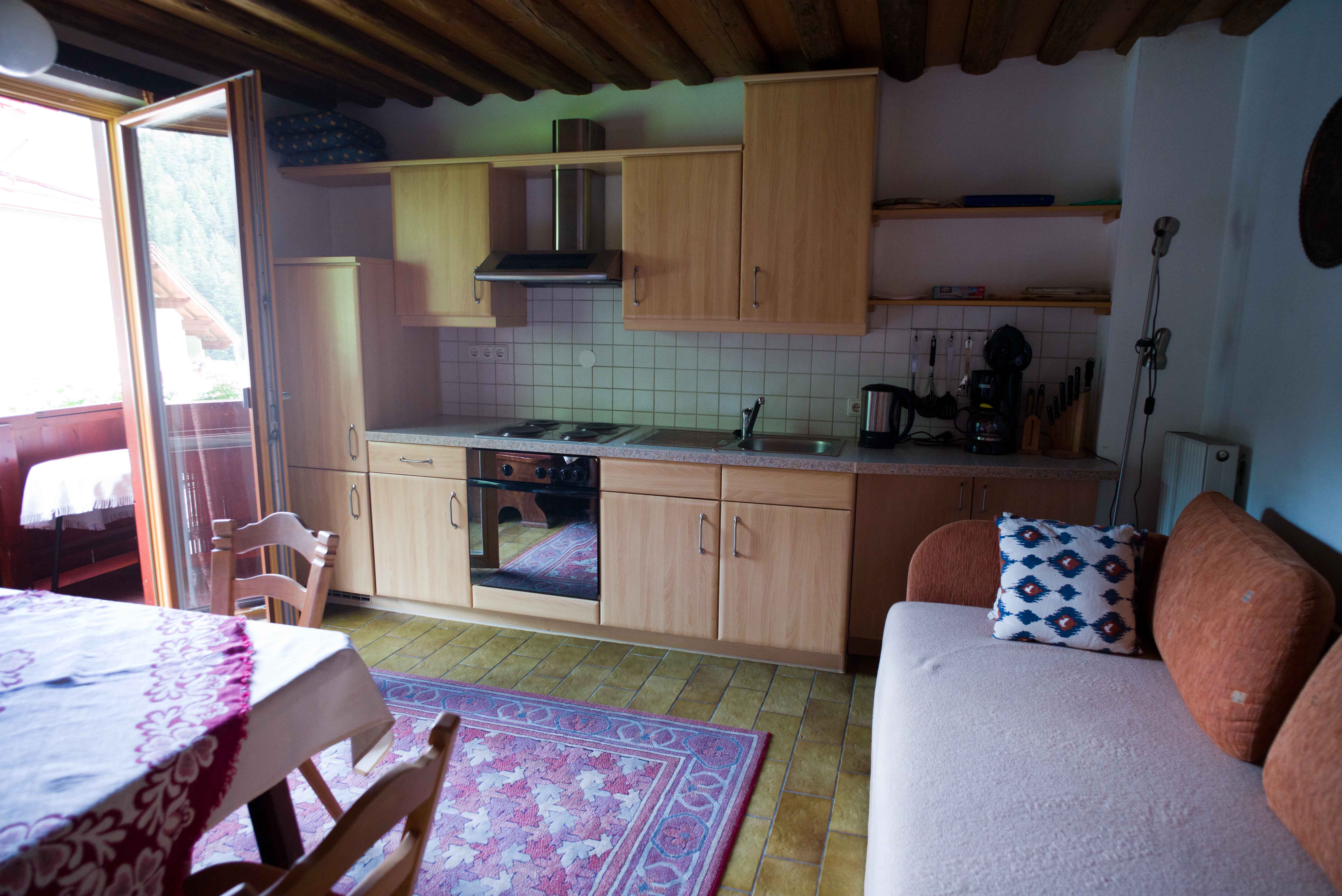 Zirben-Doppelzimmer mit Doppelbett und folgender Ausstattung: Zweckmässig ausgestattete neue Küche mit Granitabdeckung, Backofen und Kaffeemaschine (Filter) Wohn-/Essbereich mit Doppelschlafcouch sowie Tisch mit vier Stühlen TV, Internet/WLAN, Badezimmer (mit Dusche, Waschbecken, Föhn), separates WC