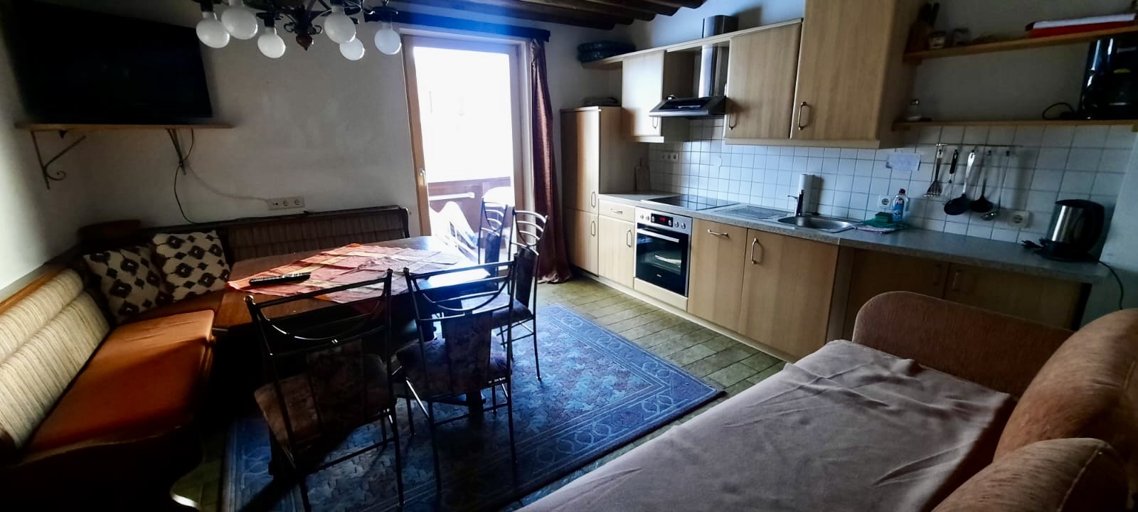 Dreibettzimmer mit Doppelbett, Einzelbett und folgender Ausstattung: Grosszügig ausgestattete neue Küche mit Granitabdeckung, Geschirrspühler, Backofen und Kaffeemaschine (Filter) Wohn-/Essbereich mit Doppelschlafcouch sowie Tisch mit Eckbank und Stühlen TV, Internet/WLAN, Badezimmer (mit Dusche, Waschbecken, Föhn), separates WC